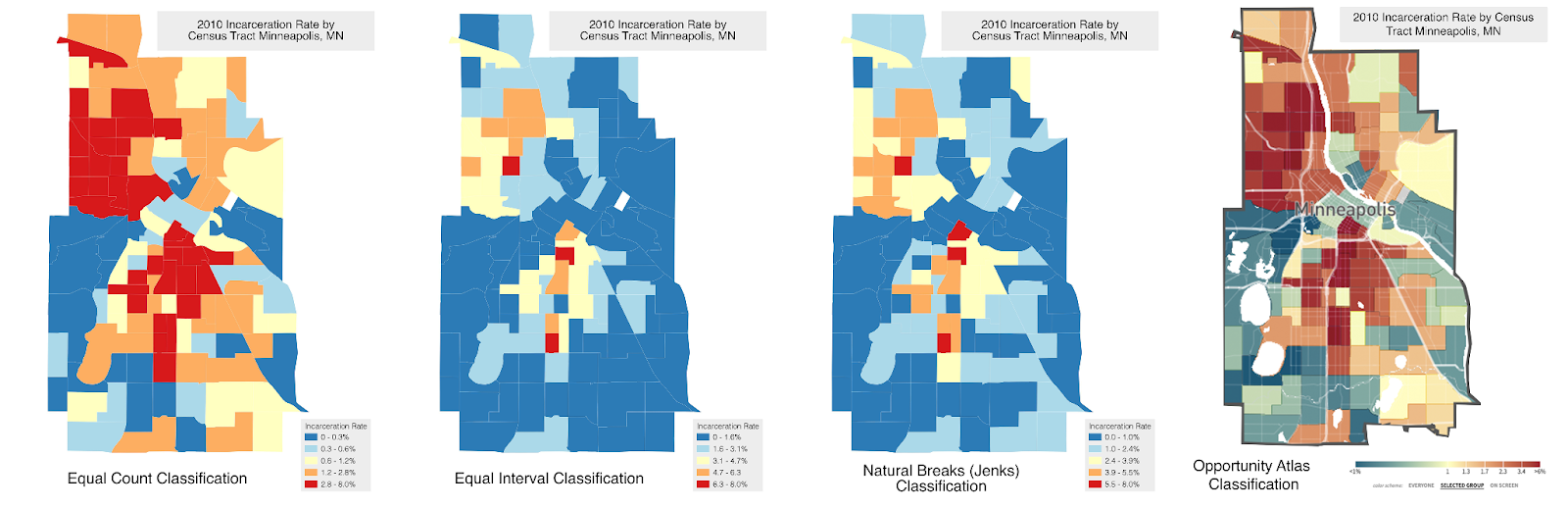 As we can see, the same data on incarceration in Minneapolis can “truthfully” be displayed in a variety of ways. When interpreting data on Opportunity Atlas, it is important to understand the subjective breaks in color that the atlas uses.