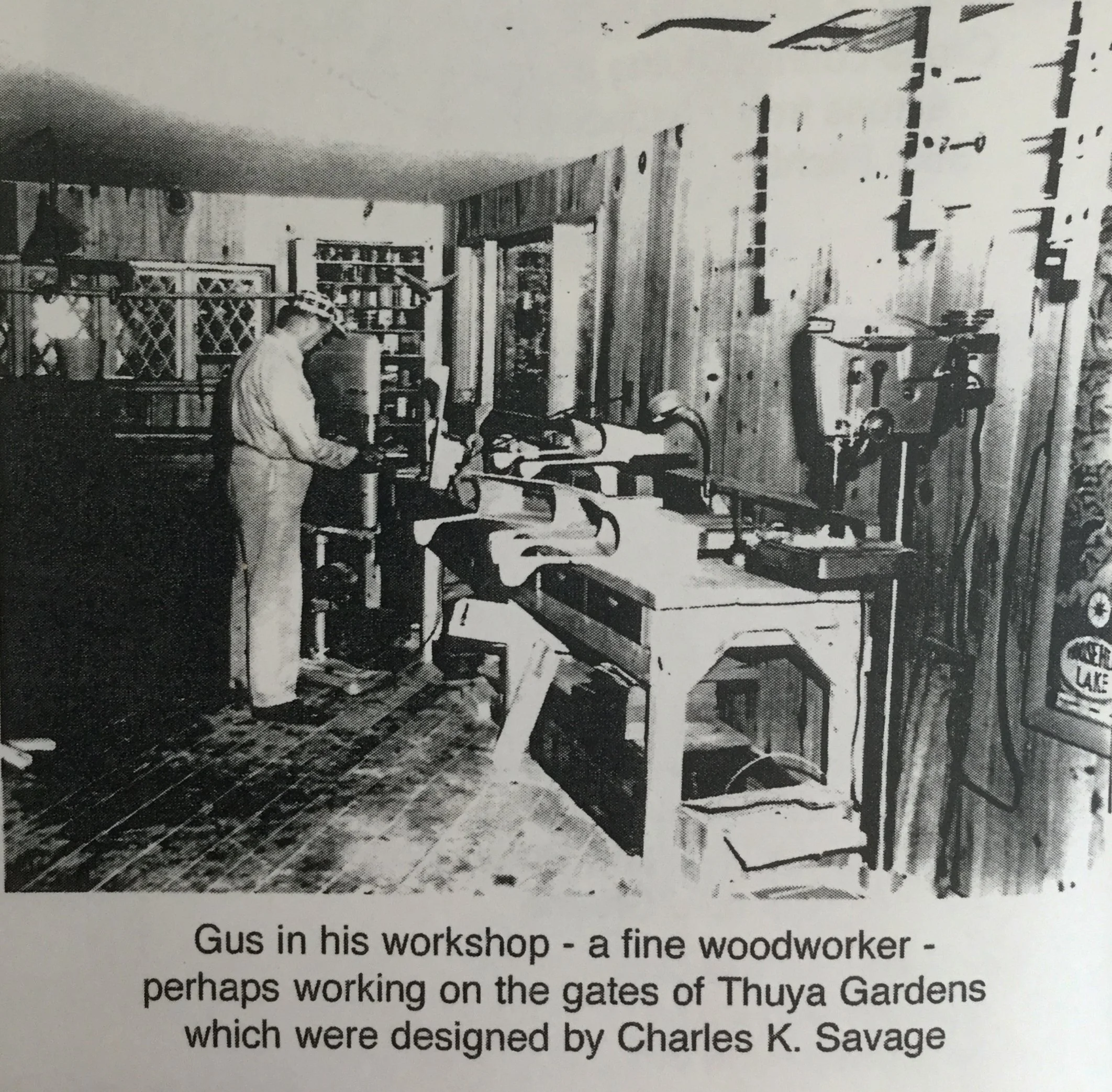 It was Savage’s vision for a pair of large cedar gates with hand-carved panels that gave Gus the opportunity to demonstrate more than his talent for carpentry. The cousins discussed the individual panel designs—twenty-four for each gate. Almost all would depict a local plant or animal—a fiddlehead, a jack-in-the-pulpit, a rabbit, a frog, etc. Visitors to the garden would be greeted by an entrance that was both functional and artistic. Gus agreed to take on the carving project and the construction of the gates that would house the panels. Savage would carve two additional larger panels out of mahogany to identify Thuya Garden and Thuya Lodge. All fifty panels would be set into the gates. As Gus carved away in his workshop, many relatives and friends found excuses to seek him out there. Crossing the threshold into the shop, they were greeted by the spicy sweet fragrance of cedar shavings and chips. Lingering became a habit.