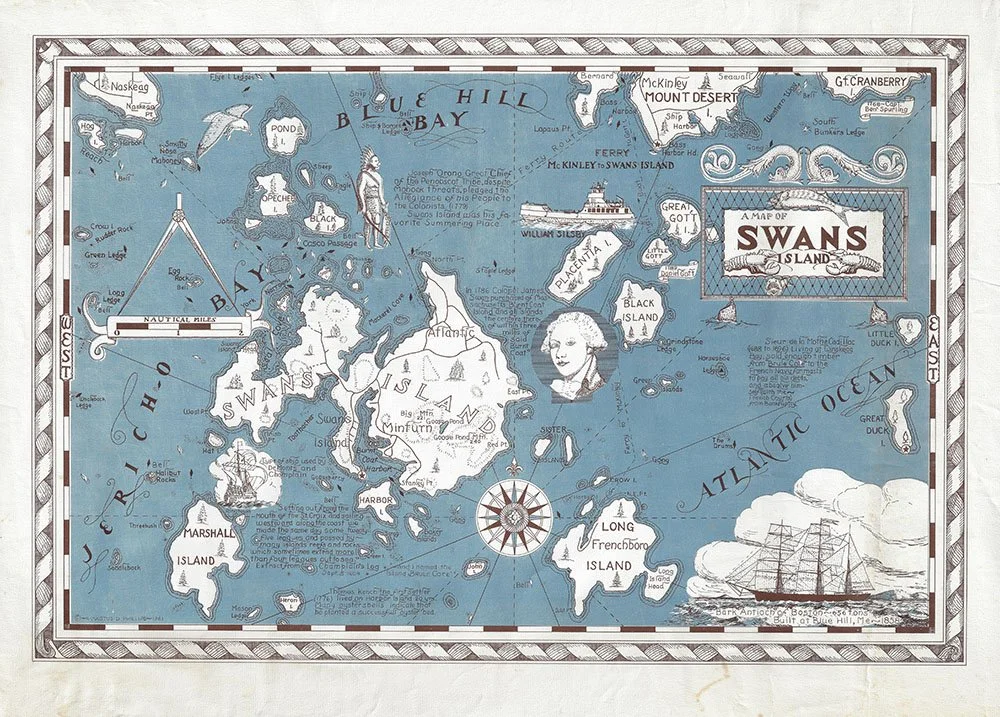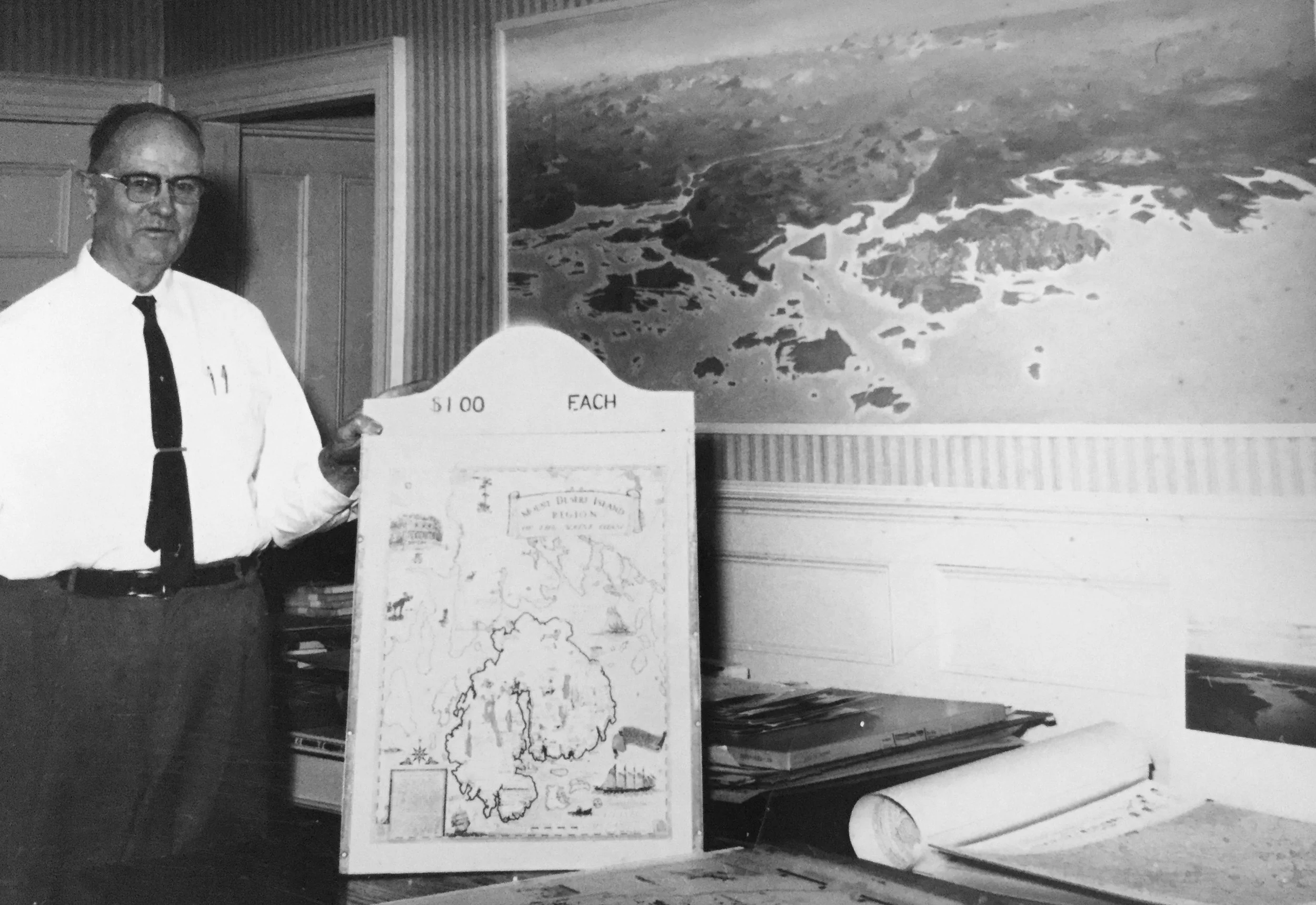 By the time Thuya Garden opened its gates to the public in 1962, Gus was steadily engaged in running the variety of jobs that his postcard and map business required. With his camera, he explored the state, taking his own images. He spent winter evenings choosing which photos to turn into postcards. Inspired by his late brother’s pictorial cartography, he had begun to create his own maps. Over the next several years, Gus’s mapmaking would evolve as his love for painting landscapes and emerging techniques in printing influenced his cartography and resulted in a unique series of maps. In 1963, Gus published his map of Swans Island.