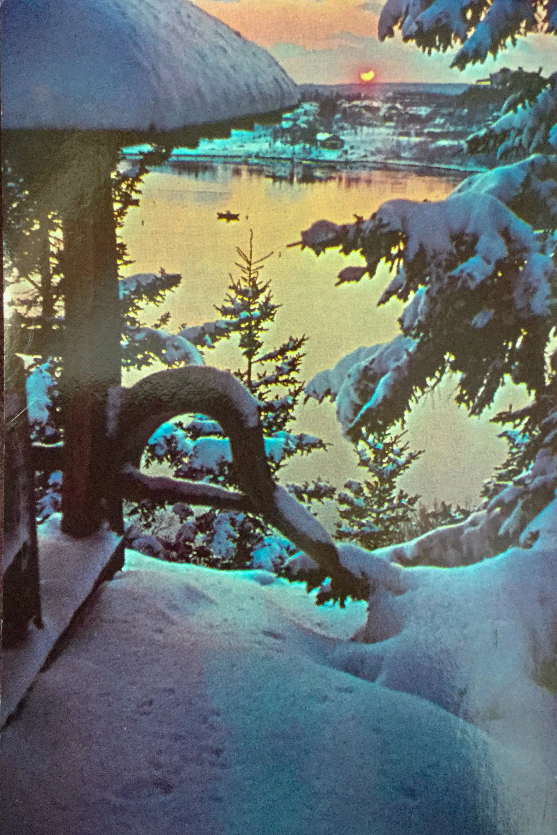 Gus’s Postcard of one of the Asticou Terrace shelters in winter at sunset,