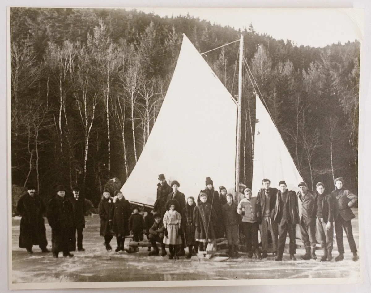 Ice boating on Lower Hadlock Pond, Northeast Harbor, Maine 1910. Gus is the seventh from the right in the front row. Photo courtesy of