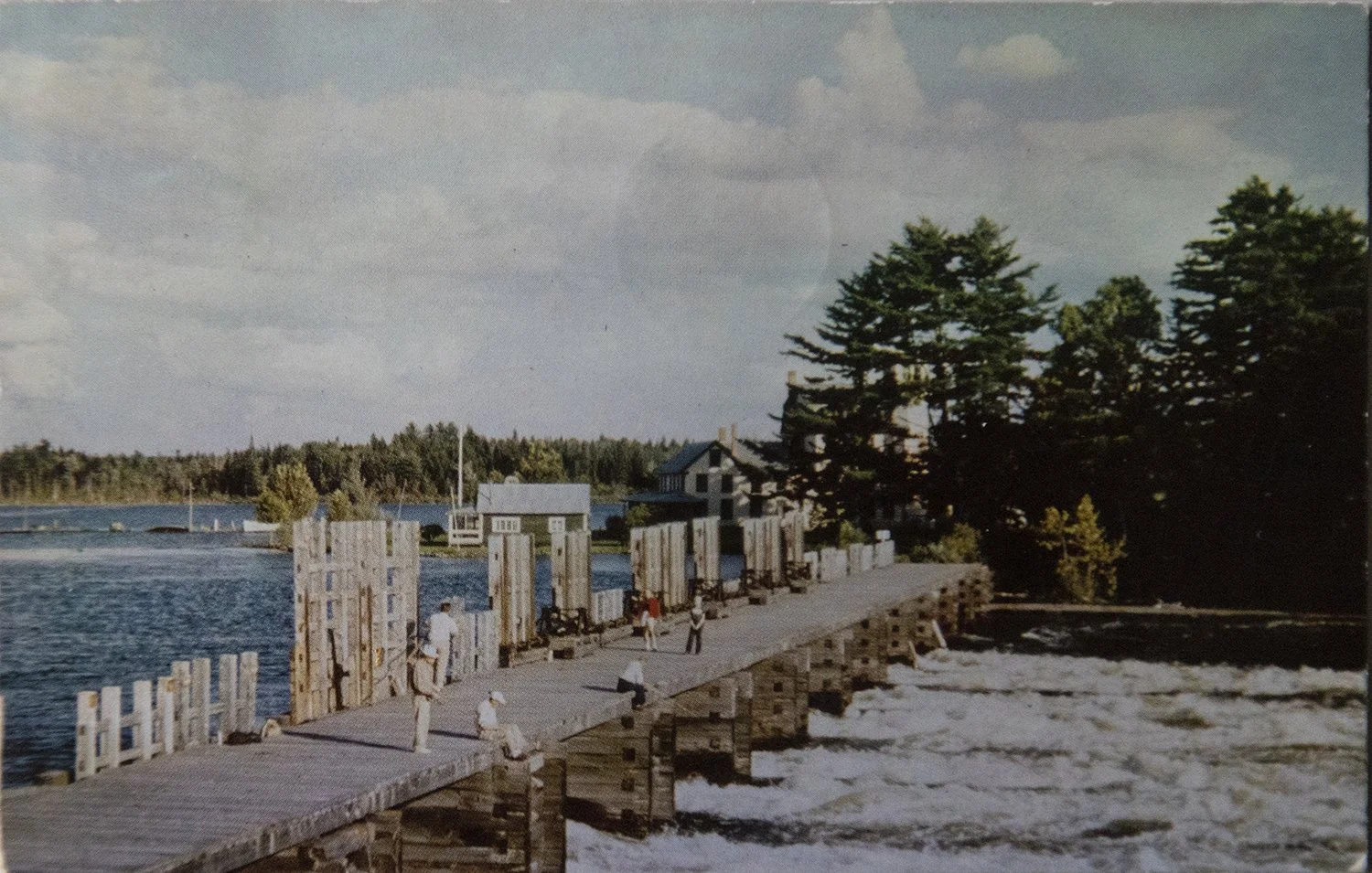 The dam at East Outlet with Wilsons on Moosehead Lake in the back ground, circa 1955.