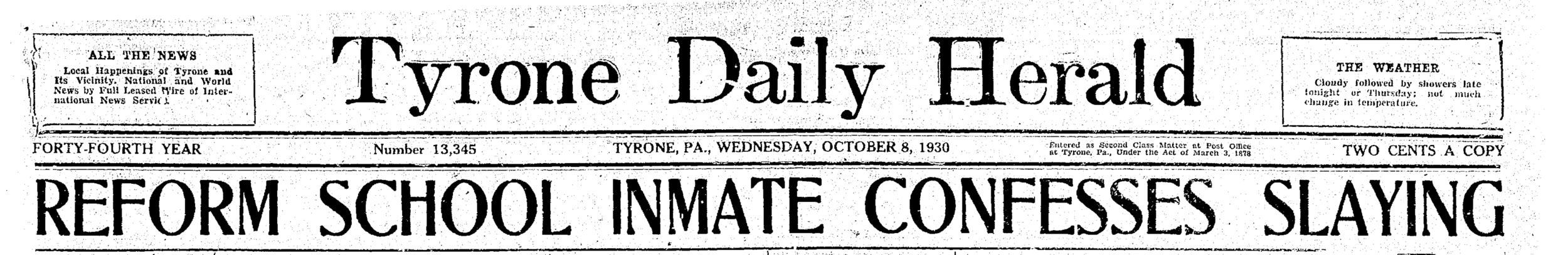 Alexander Williams confession was the headline news of the Tyrone Daily Herald in Tyrone, Pennsylvania.